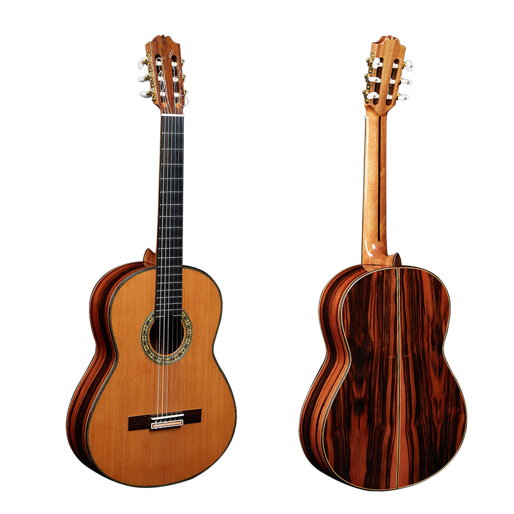AG-200 is made of traditional Spanish heel and neck joint, and its traditional fan support can achieve maximum resonance, sustain and advanced functions. Solid cedar Top to achieve a warm classic nylon string tone, and the back and sides are made of rotary cut Java ebony to create an exaggerated visual effect. It is hand-made, with hand inlaid hole flowers, hand-made 45 ° angle back center line, rosewood fingerboard and ebony bridge, savarez string and copper plated tuning machine. No less than the traditional standard guitar, it is beautiful.