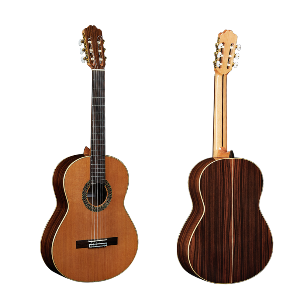 AG-50 is a great choice for beginners or intermediate guitarists. Indian Rosewood Back and sides panels, as well as solid cedar panels to achieve a warm classic nylon string tone. We offer Maple edging and Rosette in contrast style. AG-50 is made of traditional Spanish heel neck joint, and its traditional fan support can achieve maximum resonance, sustain and advanced functions. It is hand-made, with hand inlaid hole flowers, rosewood fingerboard and ebony bridge, savarez strings and copper plated tuning machine. Good price and nice practice guitar.